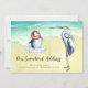 Cute Penguin Blue Heron Beach Scene Snowbird Winter Temporary Address Announcement... Here's a fun card for announcing your temporary address in Florida or other southern state during the winter season. A cute penguin dressed in a winter hat and scarf lands its ice floe on a watercolor sandy beach, meeting a great blue heron watching it come ashore. All text on our custom one-of-a-kind moving announcement can be easily revised with your own details on the personalisation template.