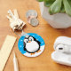 A cute black and white penguin drawing. Baby animal key chains. Snow flakes in the background. Gift idea for kids.
