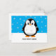 A cute black and white penguin drawing. Baby animal postcards. Blue sky and snow flakes in the background. Edit text to customise. Gift idea for kids.
