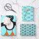 This awesome gift wrap set features a cute penguin character with a white tummy, big blue eyes with black pupils and cute orange feet and beak. This charming little winter bird is sure to delight children and adults. The penguin sits on an icy pale blue background to remind him of his chilly Arctic home.
