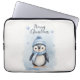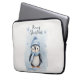 A charming winter illustration of an adorable little penguin wearing a blue striped hat and scarf, bringing a cosy and festive vibe. The soft snowflakes and gentle blue tones in the background create a magical winter atmosphere. Perfect for Christmas cards, posters, stickers, and seasonal crafts!