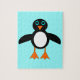 This awesome puzzle features a cute penguin character with a white tummy, big blue eyes with black pupils and cute orange feet and beak. This charming little winter bird is sure to delight children and adults. The penguin sits on an icy pale blue background to remind him of his chilly Artic home.