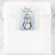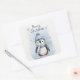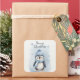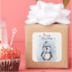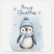 A charming winter illustration of an adorable little penguin wearing a blue striped hat and scarf, bringing a cosy and festive vibe. The soft snowflakes and gentle blue tones in the background create a magical winter atmosphere. Perfect for Christmas cards, posters, stickers, and seasonal crafts!