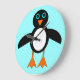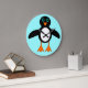 This awesome clock features a cute penguin character with a white tummy, big blue eyes with black pupils and cute orange feet and beak. This charming little winter bird is sure to delight children and adults. The penguin sits on an icy pale blue background to remind him of his chilly Artic home.