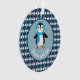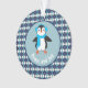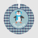 This charming penguin is wearing a scarf and earmuffs for a festive, wintry look. It's surrounded with a plaid-like argyle pattern, similar to the patterns found in some fancy socks.