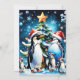 Cute penguins in a cheerful cartoon style, all wearing festive Santa hats. They stand around a magnificently decorated Christmas tree, decorated with colourful ornaments in various shapes and sizes. A large golden star shines at the top of the tree, giving the whole image a festive glow. This design captures the essence of Christmas in a playful way, conveying a feeling of warmth, joy and community in the middle of a wintry landscape.