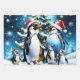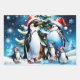 Cute penguins in a cheerful cartoon style, all wearing festive Santa hats. They stand around a magnificently decorated Christmas tree, decorated with colourful ornaments in various shapes and sizes. A large golden star shines at the top of the tree, giving the whole image a festive glow. This design captures the essence of Christmas in a playful way, conveying a feeling of warmth, joy and community in the middle of a wintry landscape.