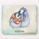 A personalised mouse pad with an adorable illustration of a penguin couple cuddling together. Wearing winter scarves and hats. Set on a cream coloured vintage texture with turquoise accents along the edges.