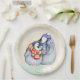 Paper plates with an adorable illustration of a penguin couple cuddling together. Wearing winter scarves and hats. Set on a cream coloured vintage background with turquoise accents along the edges