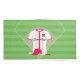 Cute baseball themed design. Featuring on the front a red and white striped baseball jersey which can be customised with a name and number, a red baseball cap, baseball and baseball bat. The background features a baseball field.