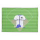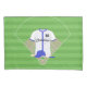Cute baseball themed design. Featuring on the front a blue and white striped baseball jersey which can be customised with a name and number, a blue baseball cap, baseball and baseball bat. The background features a baseball field.