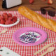 Adorable personalised Happy Birthday possum themed birthday party plates. A cute possum in a pink and purple birthday hat, with gifts and balloons celebrating a birthday.