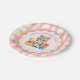 Adorable personalised Happy Birthday kitten themed paper plates with a sweet watercolor kitten holding a cupcake surrounded by birthday gifts. Charming coral plaid background.