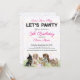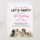 "Come, Run, Play Let's Pawty". Invite them to your precious pet's birthday with these cute and fun puppy dog party invitations featuring puppies, party hats and confetti. The words "Let's Pawty" are in a fun paw print text. Use the provided templates to personalise them with your pet's age, name, and party details. You can also change the pink and/or black text colours to your favourite. A cute confetti pattern adorns the front and back of the card.