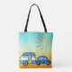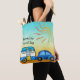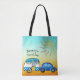 Cute travel tote bag for vacationers, road-tripping retirees, full-time RV-ers, and side hustlers who work from a tiny house on wheels (THOW). A wee blue car pulls a festive looking polka-dotted blue and yellow camper. The sky is clear, the sun is shining and it's time to GO. The text on one side of the tote says, "Beverly's Travel Bag" and can easily be personalised with your own name and words. The other side of the bag displays the same graphics, without text.
