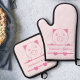 A pink Oven Mitt & Pot Holder Set with a monogrammed cute pig and customisable text inside. Perfect to make a gift to a farmer, best friend or for newlyweds or just for your kitchen decoration!