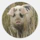 This cute set of round stickers features a beautiful photograph of a cute pink spotty pig emerging from some tall grass.