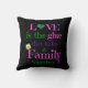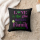 Cute Pillow, LOVE FAMILY pink lime purple on black; LOVE is the glue that holds a family together