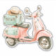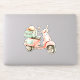 This adorable vinyl sticker features a watercolor scooter in soft shades of pink and aqua green.