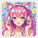 An adorable anime girl in headphones with cat ears listening to music with pink hair, purple eyes, and a floral background.