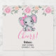 Shower / party beer bottle labels with a cute pink elephant watercolor illustration. She has cute pink and white polka dot ears and a pretty pink ribbon bow on top of her head. The top is decorated with a beautiful rose bouquet.