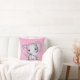 A pillow with a cute pink elephant watercolor illustration. She has cute pink and white polka dot ears and a pretty pink ribbon bow on top of her head. Polka dot background.