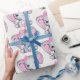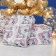 Wrapping paper with a cute pink elephant watercolor illustration. She has cute pink and white polka dot ears and a pretty pink ribbon bow on top of her head.