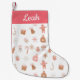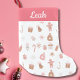 Celebrate the holidays with this cute pink themed Christmas stocking featuring pastels of brown and pink gingerbread men, snowflakes, candy canes, ornaments, candles, and presents. Personalise this cute stocking with a name.