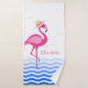 A cute pink flamingo wearing a sun hat at the beach, blue waves. Personalise and add your name, pink letters. The name is written with a modern hand lettered style script.