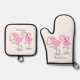 Cute pink flamingo trio cartoon illustration oven mitt & pot holder set