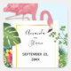 Wedding save the date stickers with a cute and whimsical pink flamingo. Surrounded by green tropical leaves, and red and yellow hibiscus flowers. A rectangle shaped, gold gradient frame in the centre.