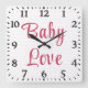 This sweet baby nursery clock for a girl's baby nursery or a girl's bedroom features a darling design with pink and white polka dots against a modern white background with text that says "Baby Love" in red script lettering. Perfect for a baby shower gift or gift for new baby girl.