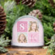 Beautiful pink 2 photo snow globe gift for a little girl. Celebrate your child with cute photographs of them on this add your own picture Christmas present with adorable pretty pink squares. Add their name and age and a 3rd pic on the back