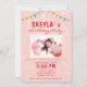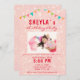 Cute Pink Glitter Girly Birthday Party Photo Invitation. Cute and fun birthday invitation for a girl. The design has beautiful colourful bunting flags on a pink glitter background. Personalise all the text on the invitation and insert your photo into the template. This joyful design can be used for various ages.