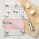 Back in the '50s they had cute kitchen towels like this gingham. We like this light and airy pink and green version of those retro plaid patterns. The red and green holly tells us it is the winter holiday season. The green script "Merry Christmas" can be edited. Remember to replace our example personal name with the one you intend.