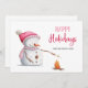 Adorable pink holiday card with an illustration of a snowman wearing pink hat and scarf. The snowman is roasting marshmallows by the fire. Illustrated and designed by Patricia Alvarez.