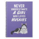 Empower your young animal lover with this inspiring pink Husky notebook featuring the powerful quote: **"Never Underestimate A Girl Who Loves Huskies."** This themed, unique design is the perfect gift for any young dog enthusiast, blending pet inspiration with a cute, girly aesthetic that every baby girl, kid, and animal lover will adore.