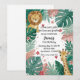 Celebrate a special first birthday with these adorable watercolor jungle animals. This sweet design features a lion and giraffe peeking through tropical leaves and flowers in soft pinks and greens. Perfect for a little girl’s woodland or safari-themed party invitation or decor.