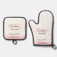 Cute pink oven mitt and pot holder with your custom name and business details. This fully editable modern oven mitt and pot holder design features a blush pink and white design, trendy script fonts, perfect to create branded oven gloves for your bakery, cake boutique, coffee shop or use as a company gift to clients and employees.