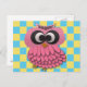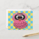 Cute Pink Owl on Blue and Yellow Chequered Postcard