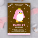Invite your guests with this cute birthday party invitation featuring an adorable little penguin with vibrant elements against a brown background. Simply add your event details on this easy-to-use template to make it a one-of-a-kind invitation. Flip the card over to reveal a pink and white stripes pattern on the back of the card.