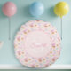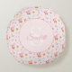 Transform a nursery or playroom into a fairytale garden with this enchanting round pillow. Set against a soft baby pink backdrop, a blush-pink bunny plays a trumpet amidst a whimsical world of purple butterflies, smiling hearts, and garden blooms.