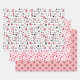 Cute wrapping sheets for Valentine's Day with three matching patterns: doodled Valentine's Day themed things like hearts, arrows, roses, and love letters in pink, white, and black. Lots of little hearts in different shapes and shades of pink. Cute red hearts on a pink background.