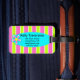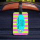 Looking for a cute pink luggage tag for travel? This fab design features lime green and hot pink stripes with smaller white stripes in the background. In the foreground, is a cute retro flower in turquoise blue, hot pink and white surrounded by four smaller flowers. The back side of this travel luggage tag features the same great stripes with a turquoise blue oval where your name can be personalised along with all your contact information. There is even another cute flower to make a great luggage tag for girls, for teens or for women. Copyright Kathy Henis