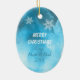 An adorable little gray and white kitten wears a pink snowflake cap and scarf while white snowflakes drift down around it. At the bottom is your child's name in white. Everything is placed on an abstract icy blue background. The back of the ornament has the same background, a few snowflakes, and your custom text in four fields. Easy to customize, and any little girl would love this keepsake ornament!