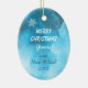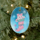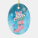 An adorable little white kitten peeks out of a pink snowflake Christmas stocking. The kitten wears a pink bow, and holds a red and white striped candy cane. A few snowflakes drift down around it. Everything is placed on an abstract icy blue background. The back of the ornament has the same background, a few snowflakes, and your custom text in five fields. Easy to customize, and any little girl would love this keepsake ornament!