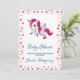 Baby shower invitation with a white winged unicorn with pink mane, tail and hooves. The horn has a rings of rainbow colour and looks like a candy lollipop. This cute unicorn is rearing up on its back legs. Sweet pink heart on its cheek. background is a pattern of pink and green hearts. Full party details are on the back side.
