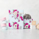 Patterned wrapping paperwith a white winged unicorn with pink mane, tail and hooves. The horn has rings of rainbow colour and looks like a candy lollipop. This cute unicorn is rearing up on its back legs. Sweet pink heart on its cheek and long girly eyelashes.