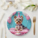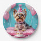 This birthday party paper plate has a c cute Yorkie with a pink birthday hat, a cupcake and some diamond and balloons bling.