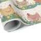 A playful pixel art pattern featuring stylized chickens standing on small grassy patches with tiny decorative elements scattered around